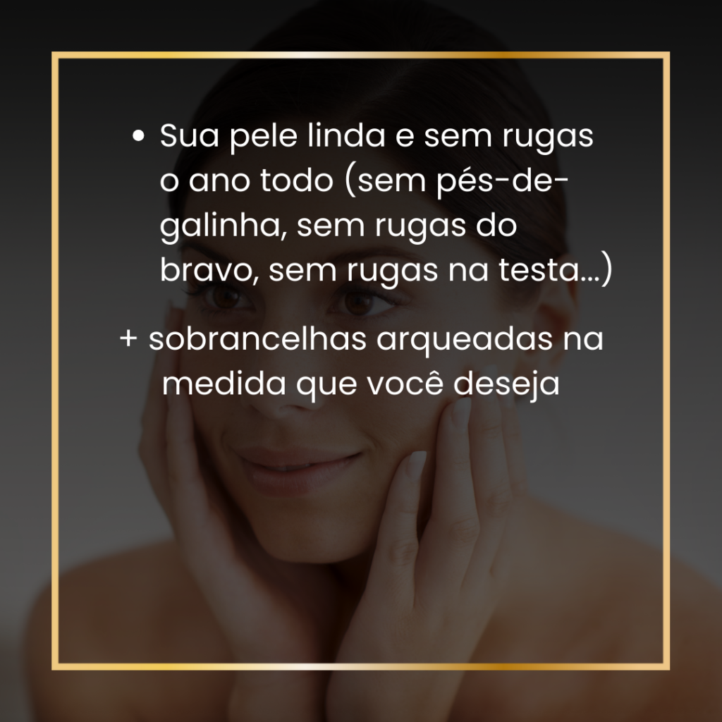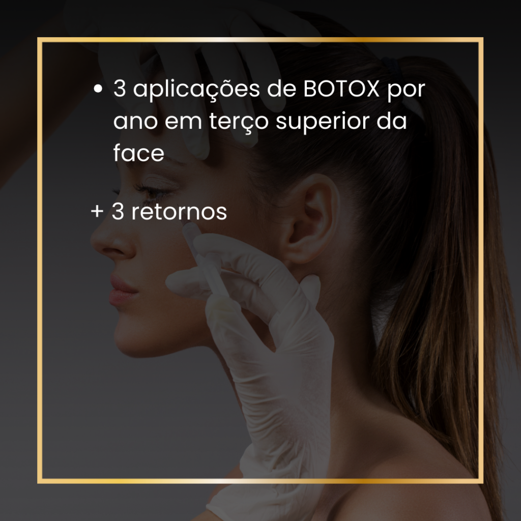 Ao entrar no Clube do Botox Foz, você garante o direito a três aplicações de toxina botulínica (conhecida popularmente como botox) na região do terço superior da face (testa, glabela e lateral dos olhos). Após 15 dias de cada aplicação é realizado um retorno, para retoques, caso necessário. Além disso, você recebe ainda diversos bônus e benefícios, conforme anunciado acima.